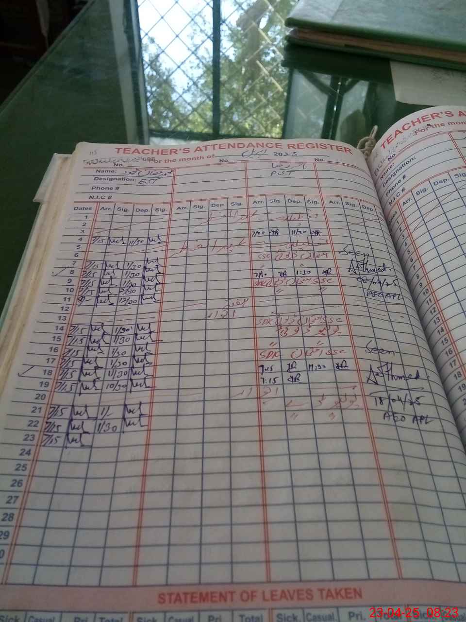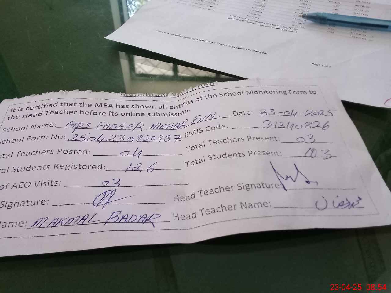 | Attendance Register | Head Teacher | MEA with School | Visit Proof |
