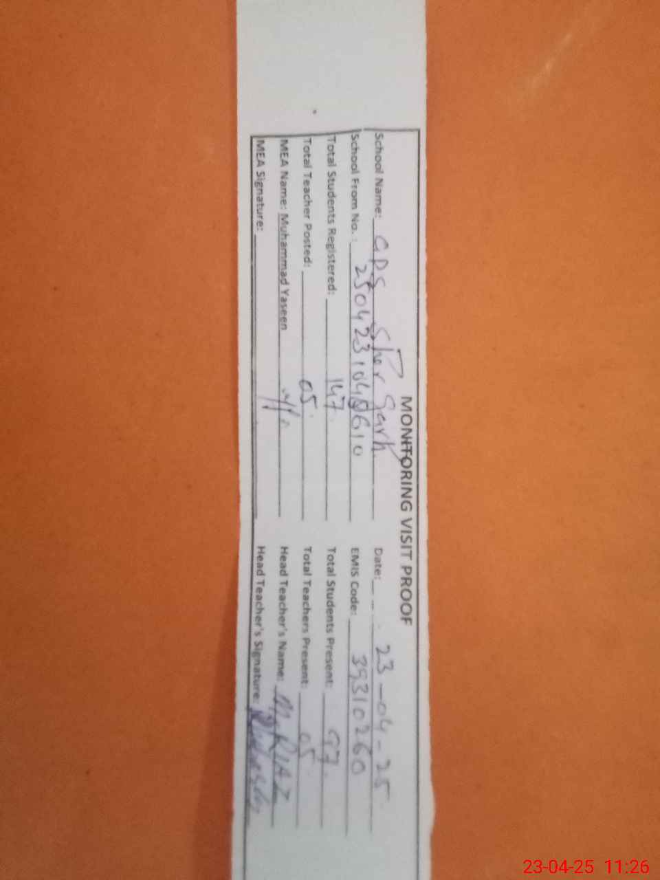| Attendance Register | Head Teacher | MEA with School | Visit Proof |