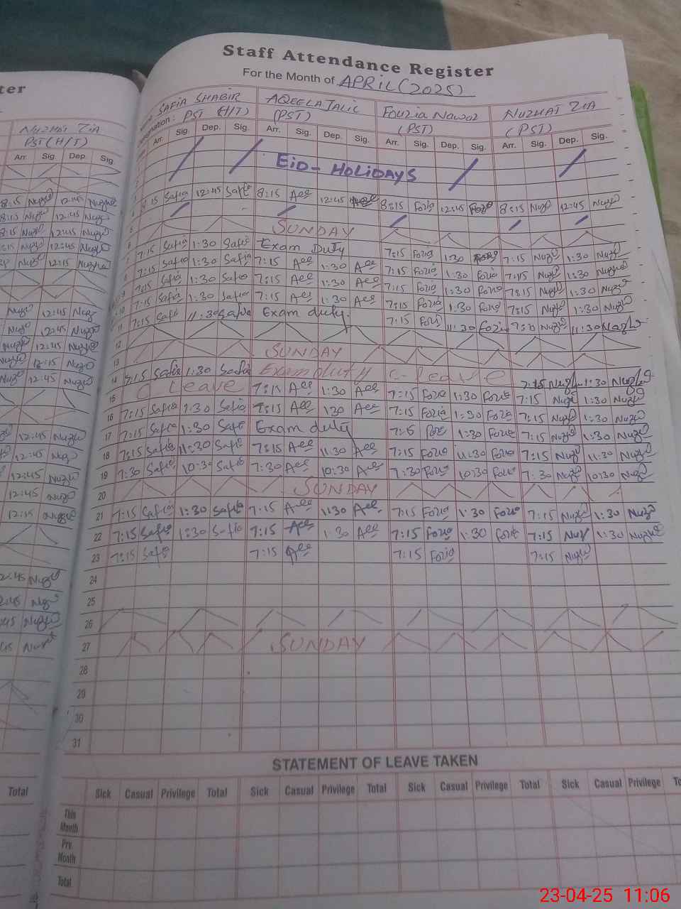 | Leave | Duty | Absent | Maternity | Medical | Ex- Pak |