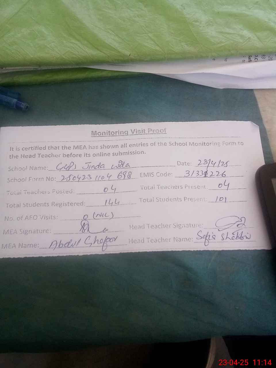 | Attendance Register | Head Teacher | MEA with School | Visit Proof |