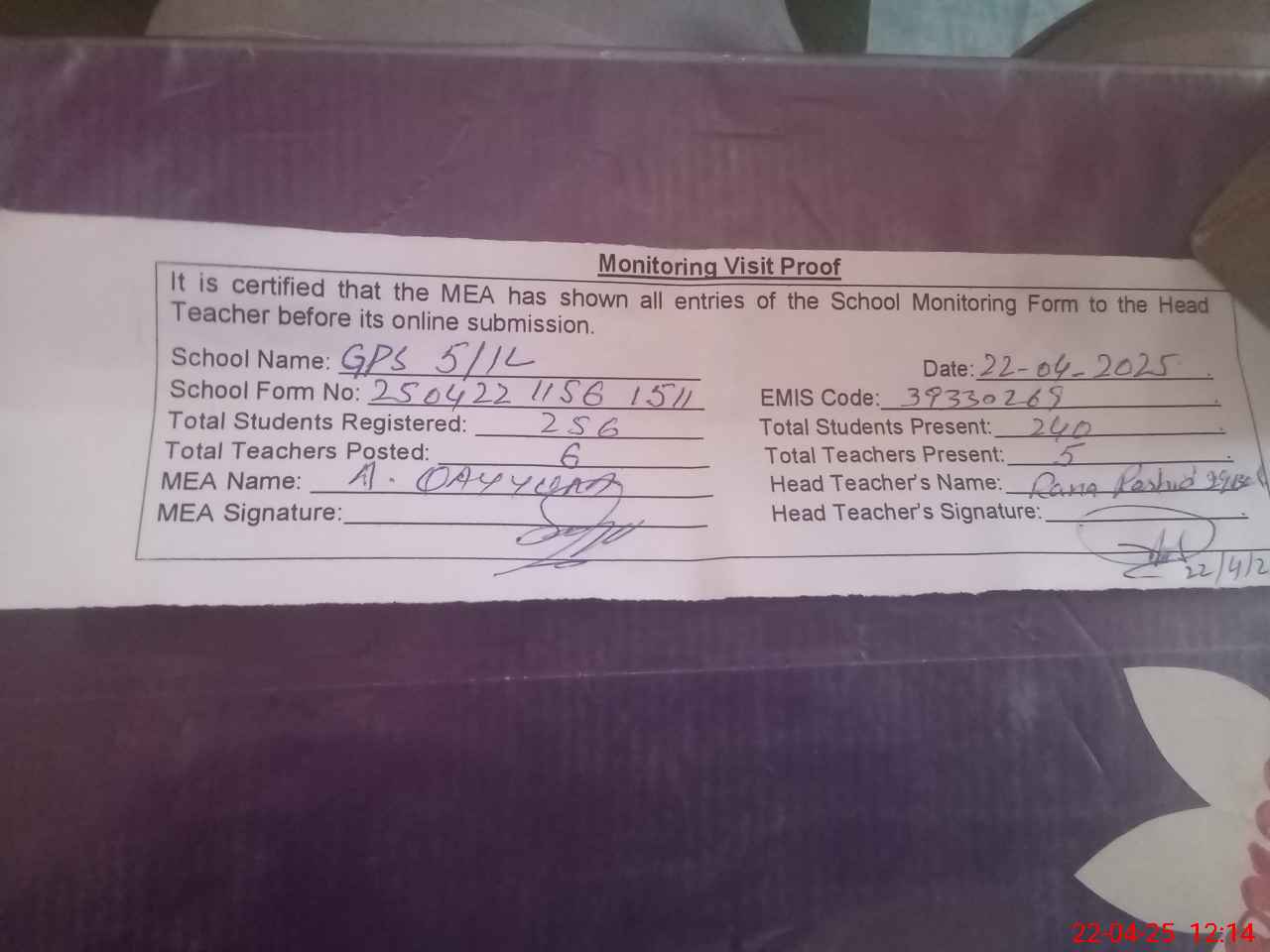 | Attendance Register | Head Teacher | MEA with School | Visit Proof |