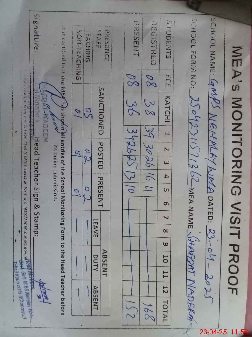 | Attendance Register | Head Teacher | MEA with School | Visit Proof |
