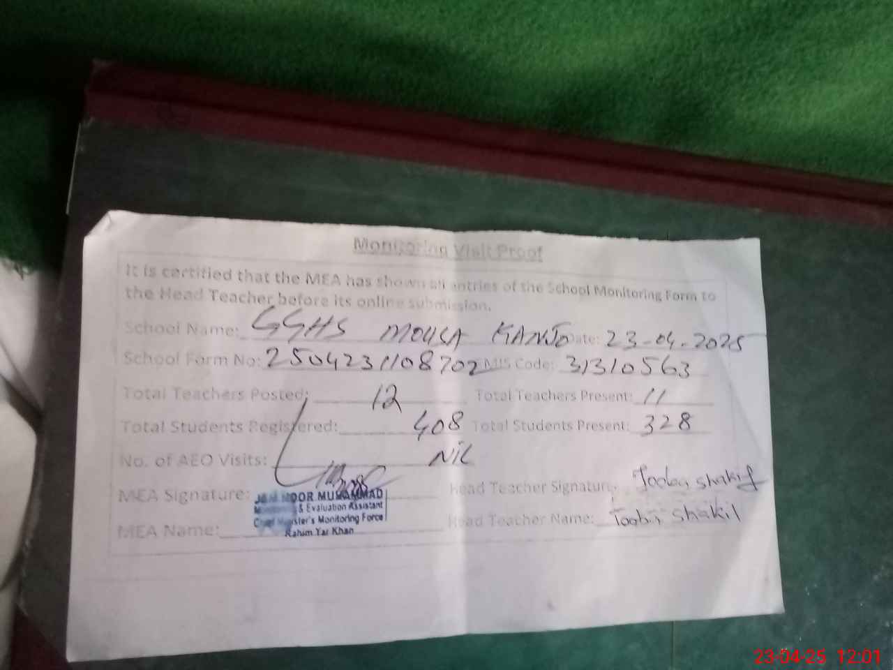 | Attendance Register | Head Teacher | MEA with School | Visit Proof |