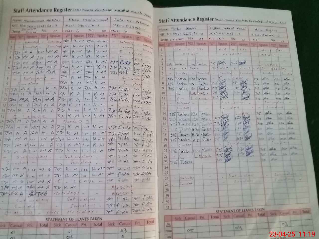 | CNIC | Full Name | Designation | R/C | Absence During Last Calender Month |