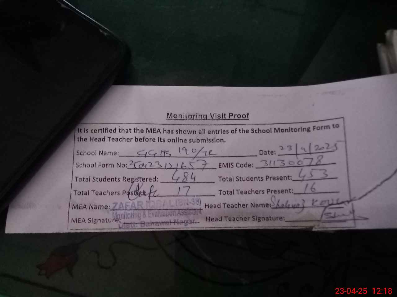 | Attendance Register | Head Teacher | MEA with School | Visit Proof |