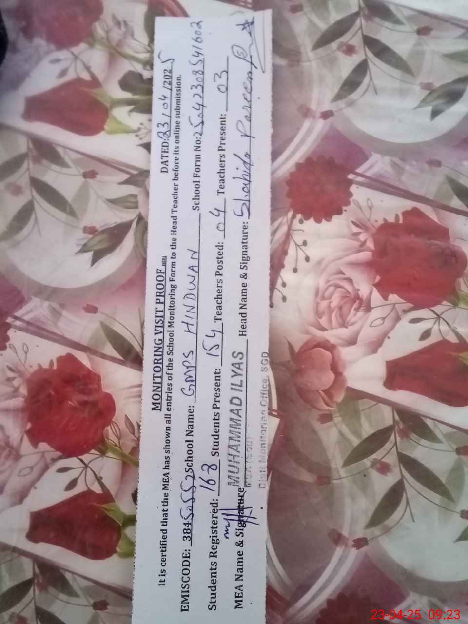 | Attendance Register | Head Teacher | MEA with School | Visit Proof |