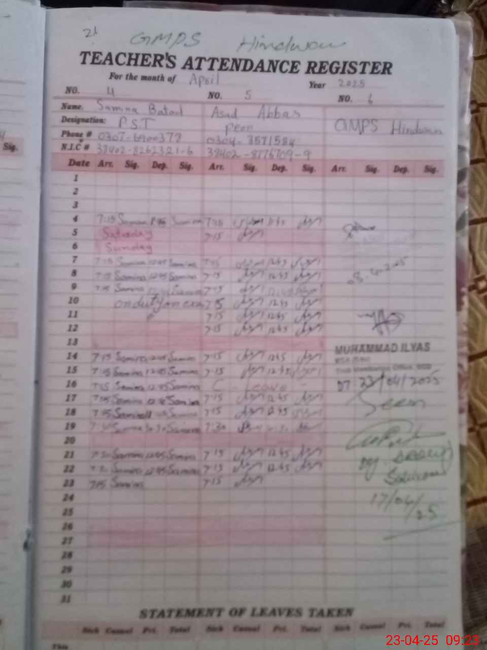 | CNIC | Full Name | Designation | R/C | Absence During Last Calender Month |