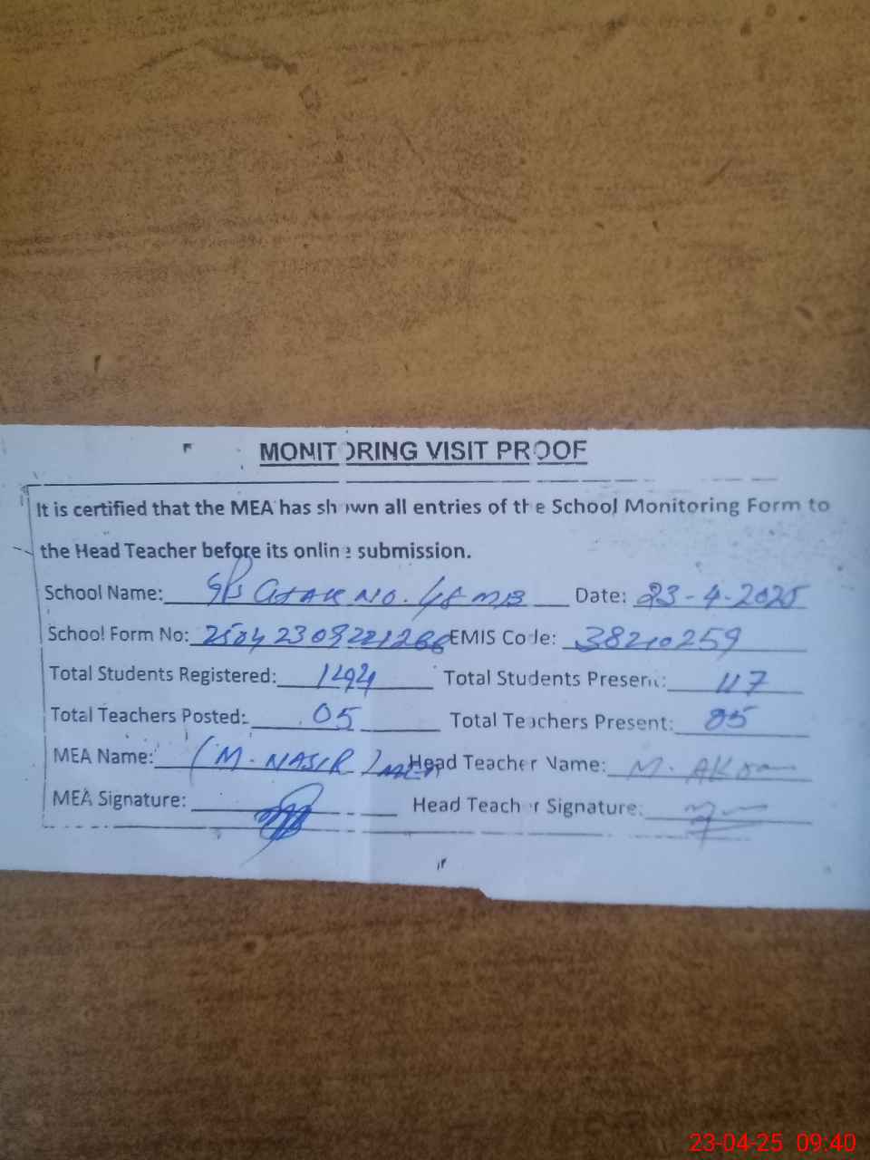 | Attendance Register | Head Teacher | MEA with School | Visit Proof |