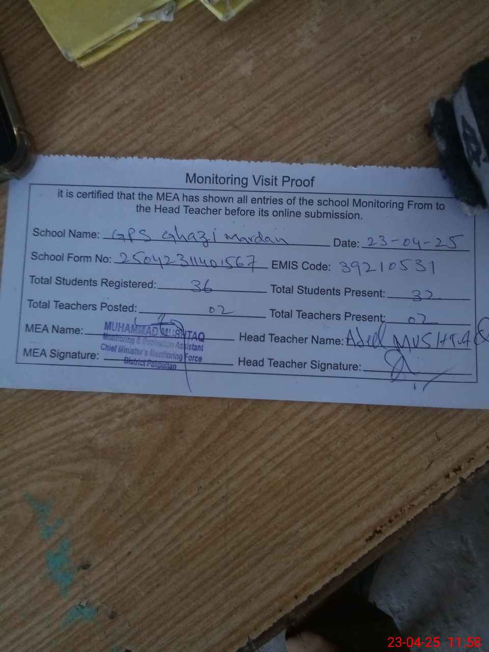 | EMIS Code: 39210531 | Name of School: GPS GHAZI MARDAN P/O CHAK BEDI | |||
