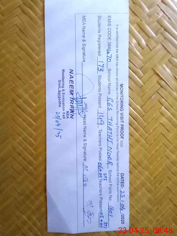 | Total no. of Classrooms: 12 No. of Classrooms Used for Teaching: 6 No. of Classrooms Storing Old Furniture, FTBs, etc: 0Comments if Any: Visit the school on 23 April 2025 GGES THATHI NOOR Building was in maintenance phase due to this all facilities were utilized from GES THATHI NOOR DAILY Rooznamcha not maintained regularly Overall cleaning not up to the mark |