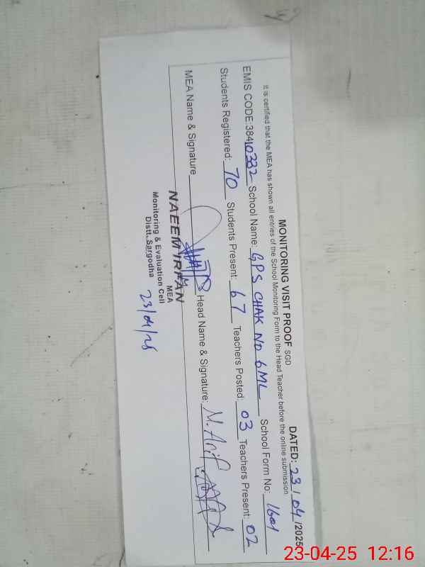 | EMIS Code: 38410332 | Name of School: GPS CHAK NO.6 ML | |||