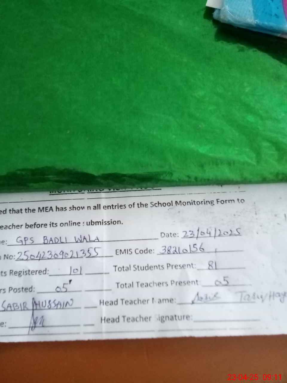 | EMIS Code: 38210156 | Name of School: GPS BADLI WALA | |||