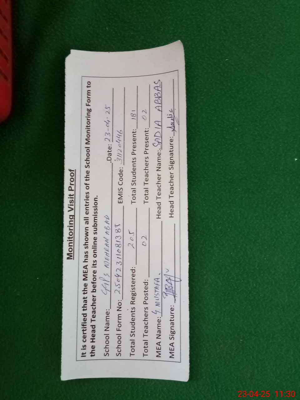 | Attendance Register | Head Teacher | MEA with School | Visit Proof |