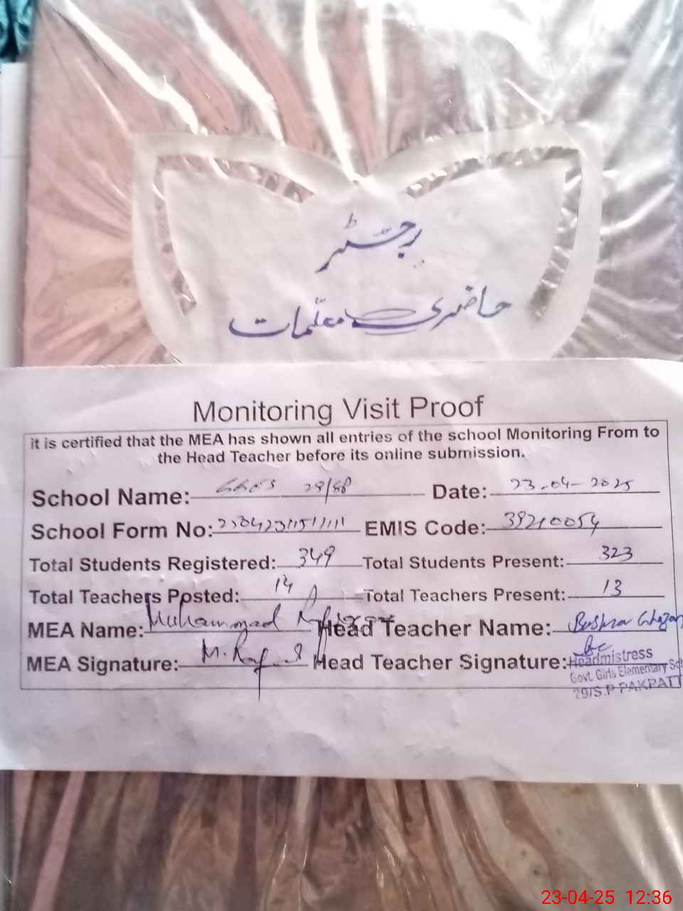 | Attendance Register | Head Teacher | MEA with School | Visit Proof |