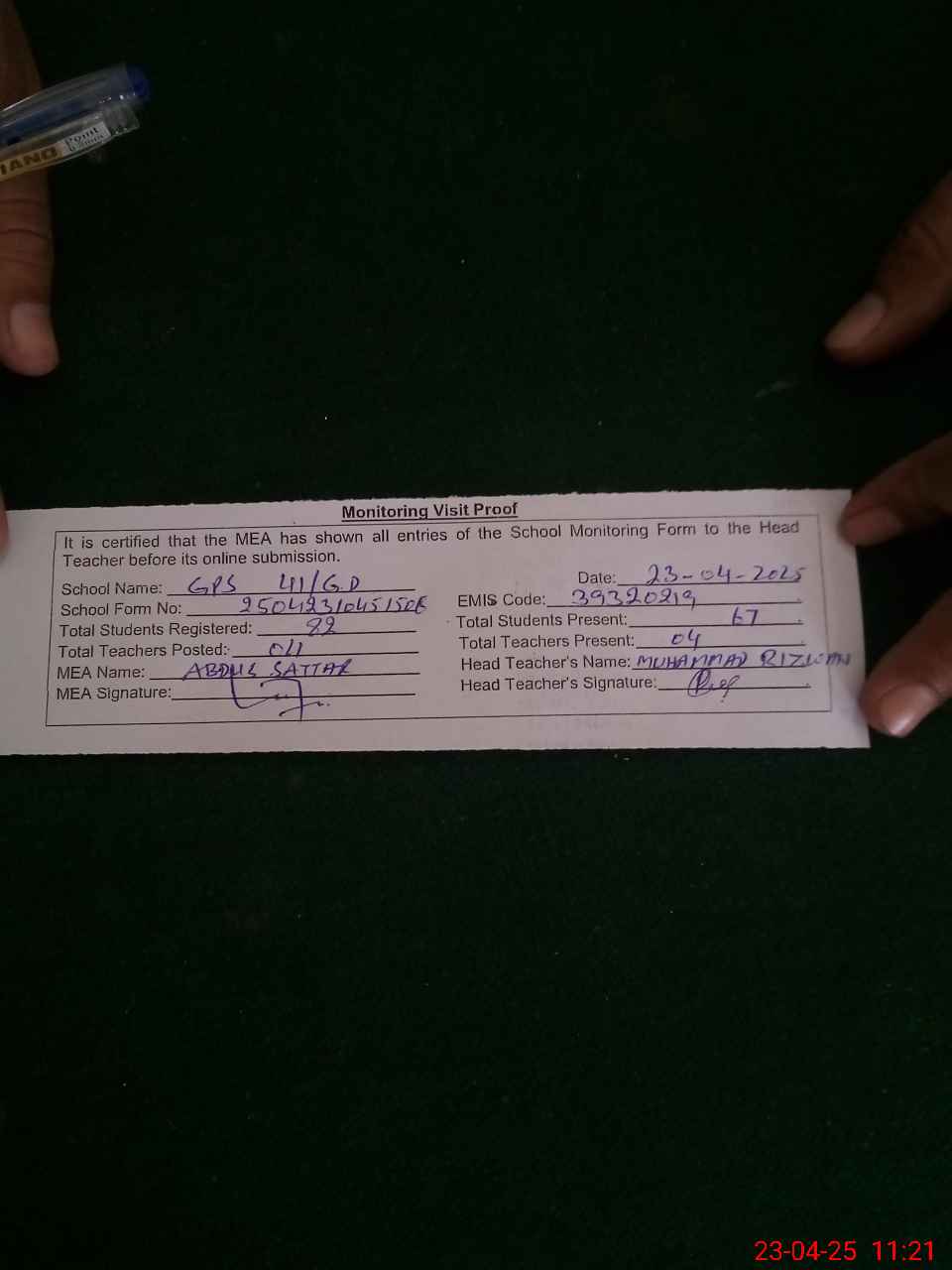 | Attendance Register | Head Teacher | MEA with School | Visit Proof |