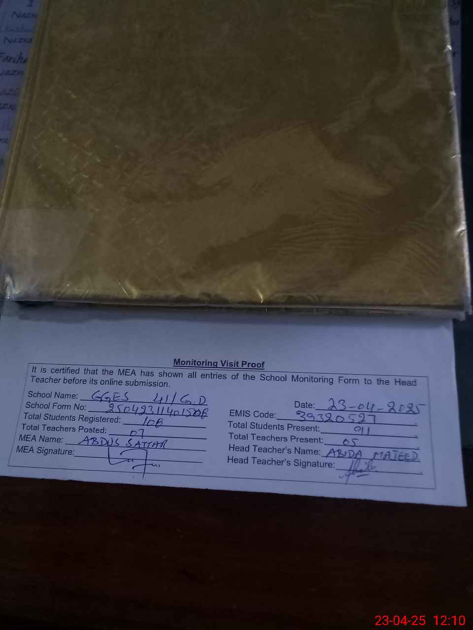 | Attendance Register | Head Teacher | MEA with School | Visit Proof |