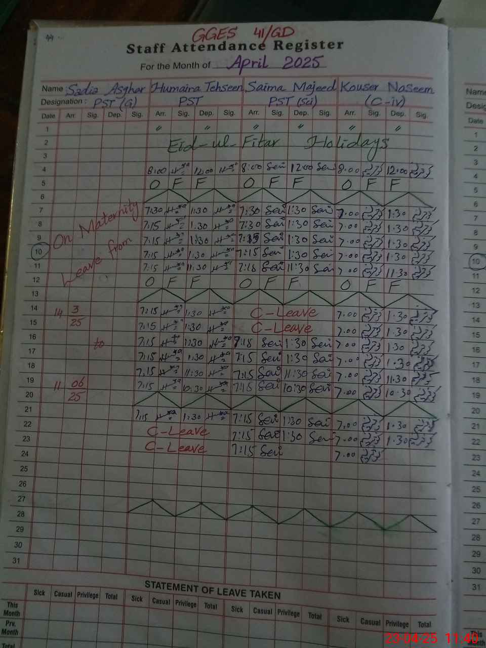 | 35**** | Sa**** As**** | PST | Regular | 19 | 0 | 0 | 18 | 0 | 0 | 0 | 0 | 1 | Maternity |