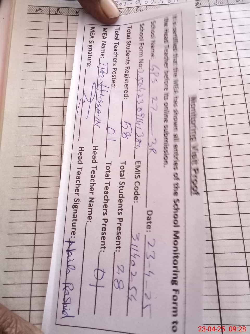 | Attendance Register | Head Teacher | MEA with School | Visit Proof |