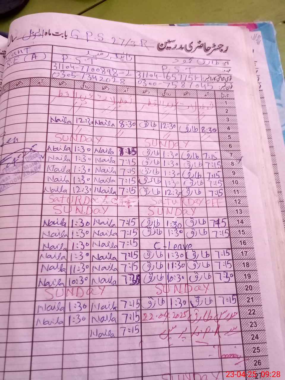 | CNIC | Full Name | Designation | R/C | Absence During Last Calender Month |