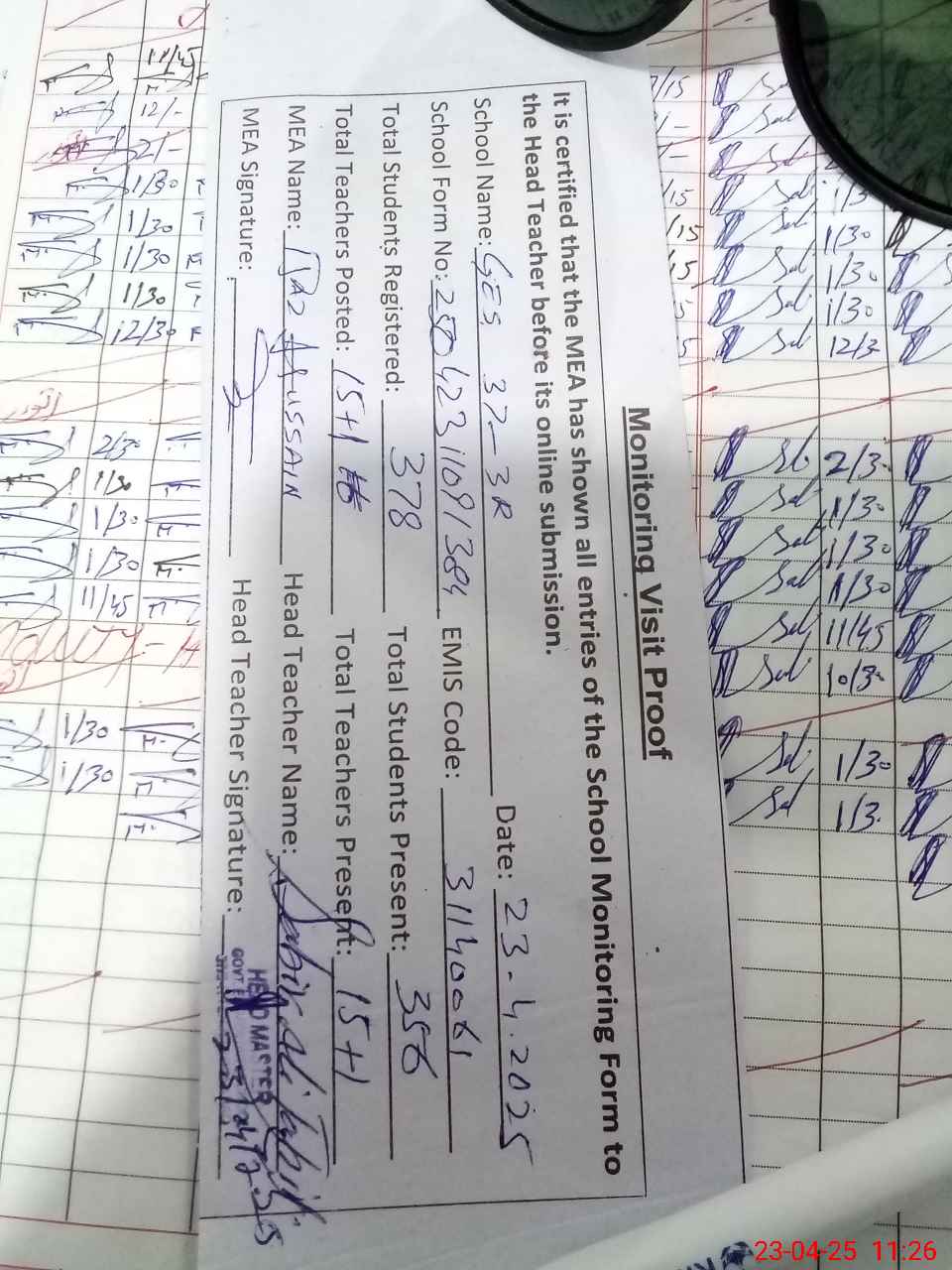 | Attendance Register | Head Teacher | MEA with School | Visit Proof |