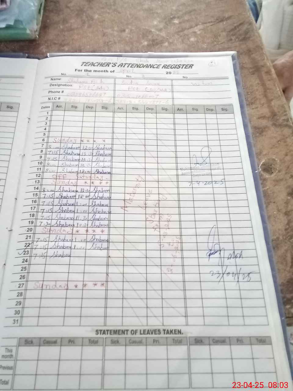 | CNIC | Full Name | Designation | R/C | Absence During Last Calender Month |
