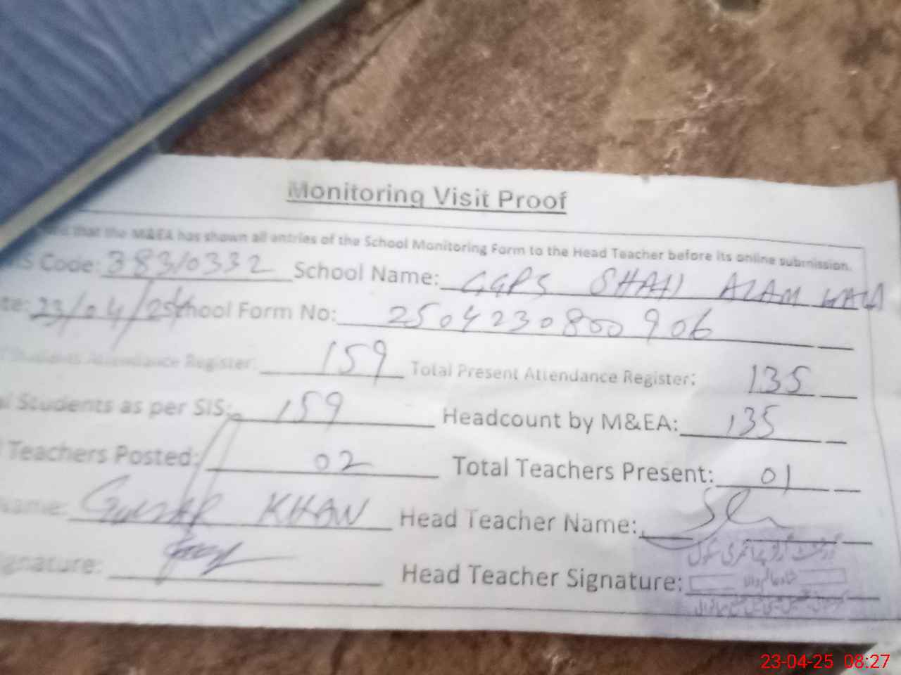 | Attendance Register | Head Teacher | MEA with School | Visit Proof |