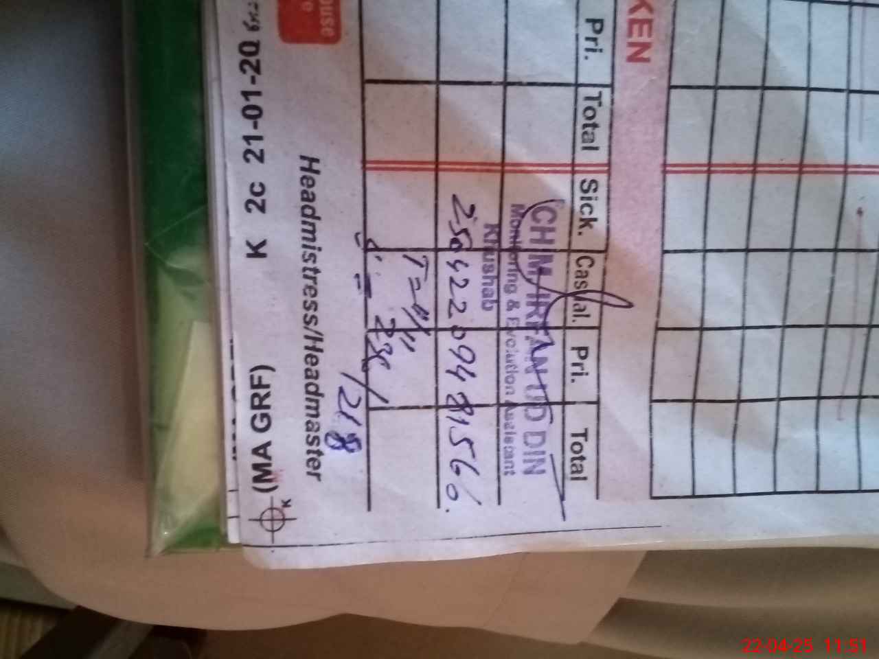 | Name: Ra**** Pe**** Designation: (School Headmaster's/Headmistress's) Sst Phone/Cell Number: 03**** |