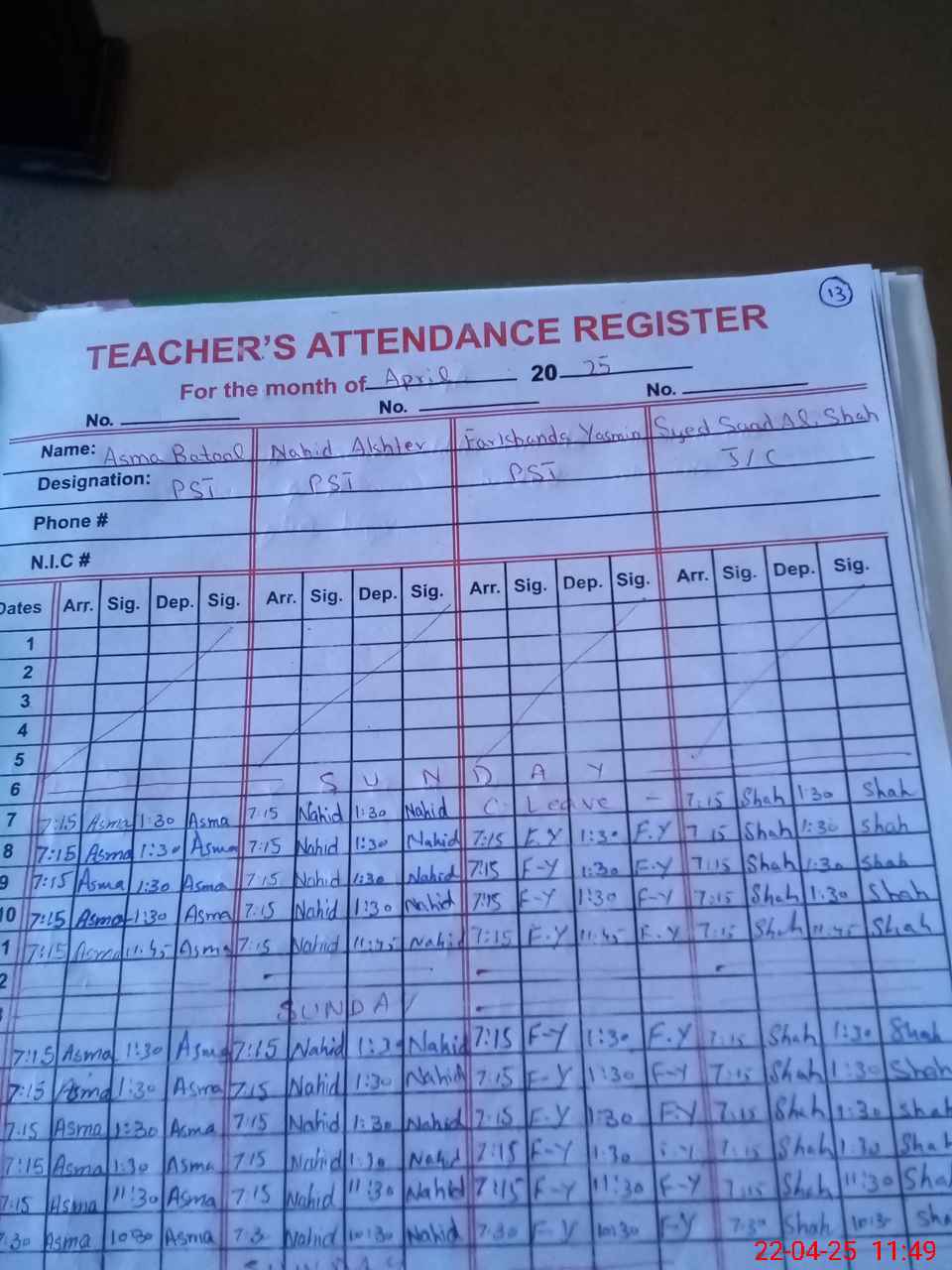 | CNIC | Full Name | Designation | R/C | Absence During Last Calender Month |