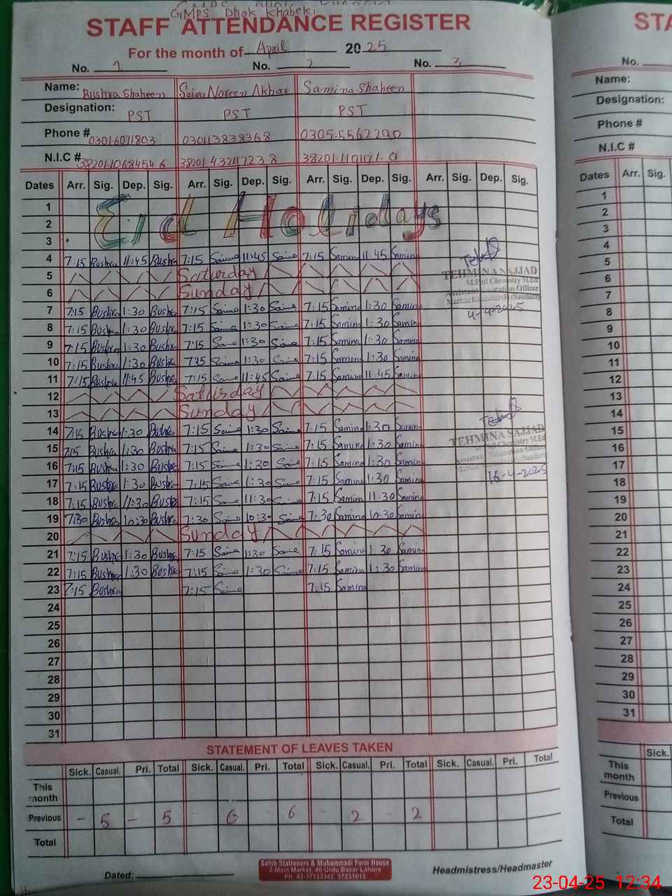 | Name: Bu**** Sh**** Designation: (School Headmaster's/Headmistress's) PST Phone/Cell Number: 03**** |