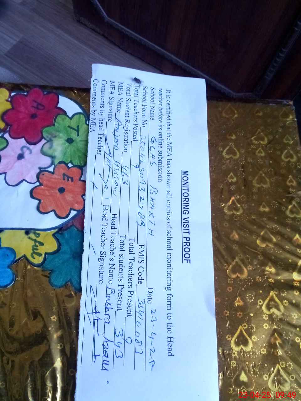 | Attendance Register | Head Teacher | MEA with School | Visit Proof |