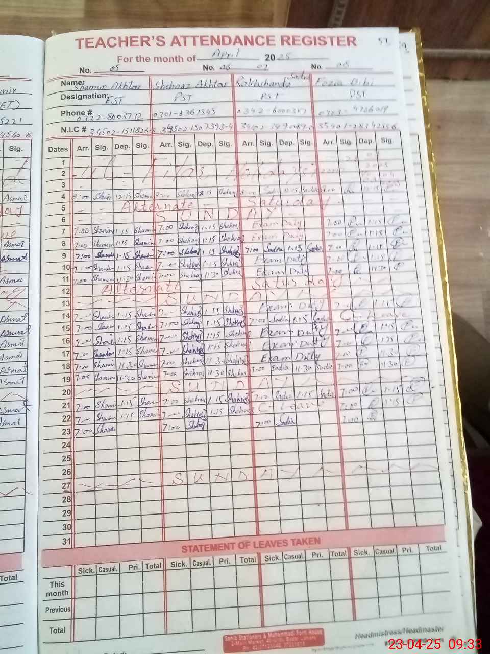 | CNIC | Full Name | Designation | R/C | Absence During Last Calender Month |