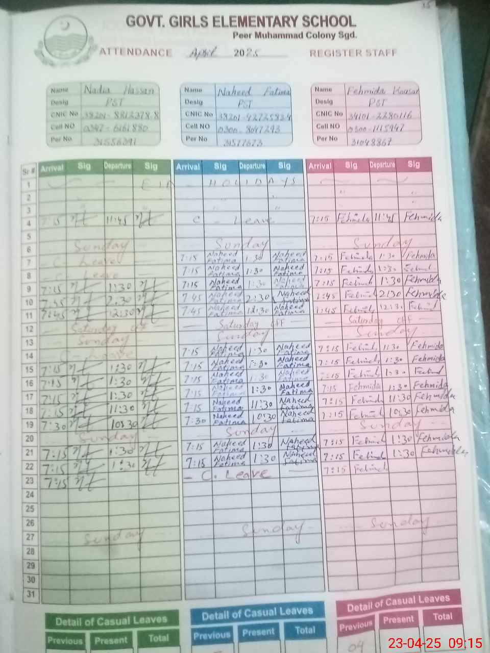 | CNIC | Full Name | Designation | R/C | Absence During Last Calender Month |