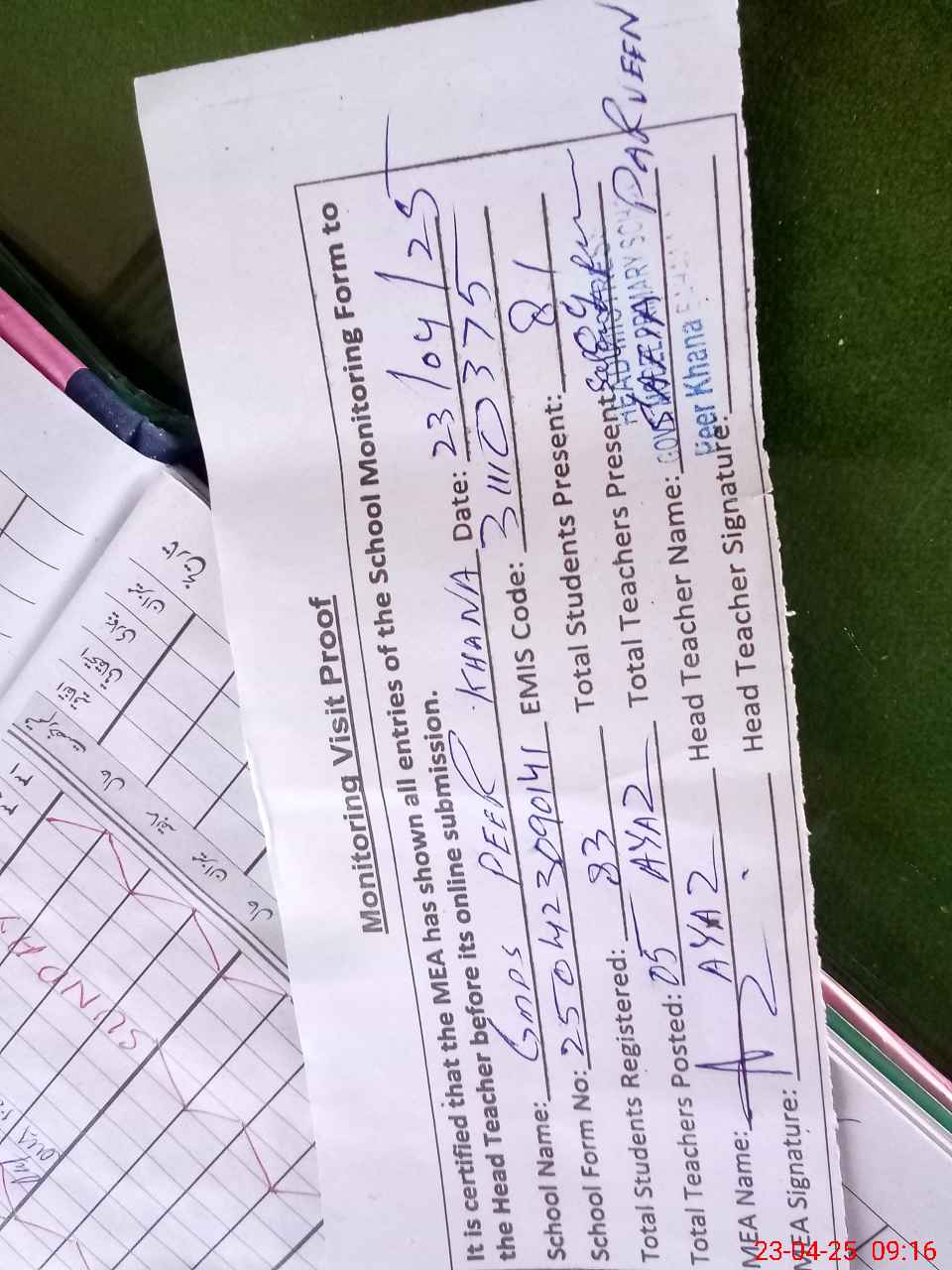 | Attendance Register | Head Teacher | MEA with School | Visit Proof |