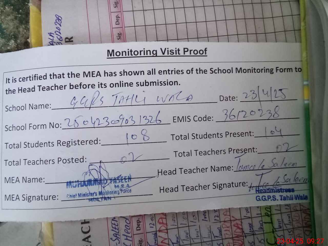 | Attendance Register | Head Teacher | MEA with School | Visit Proof |