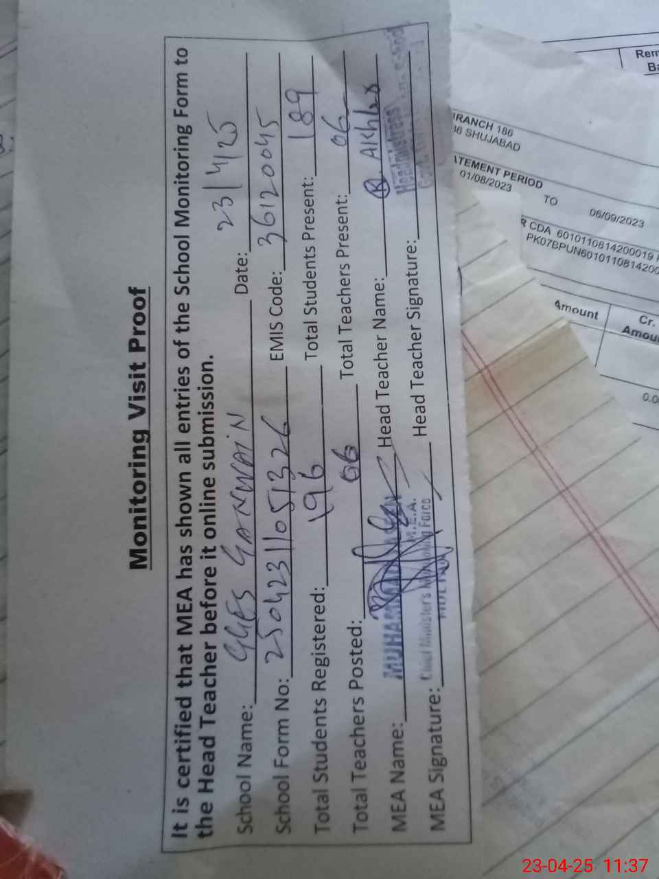 | Attendance Register | Head Teacher | MEA with School | Visit Proof |