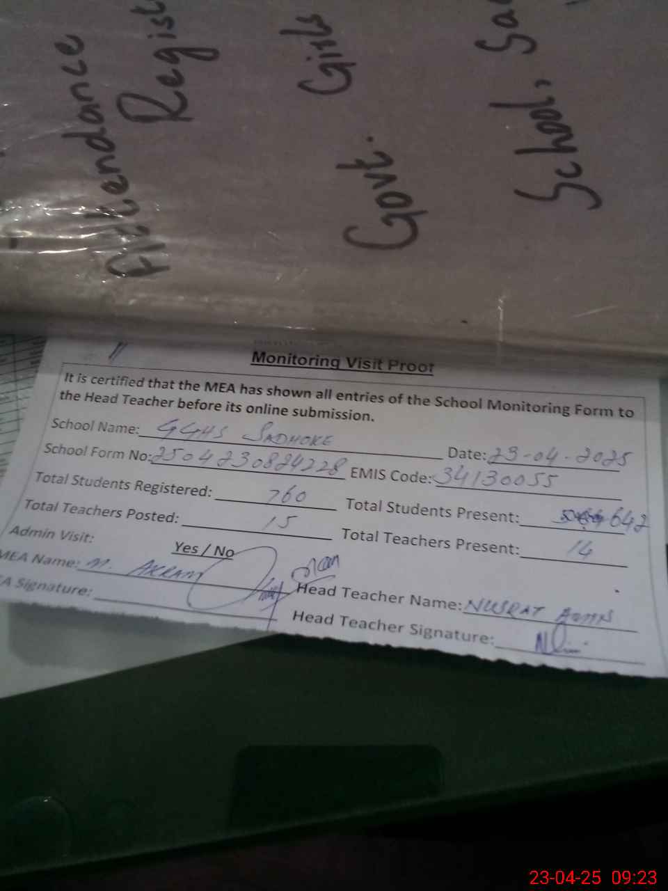 | Attendance Register | Head Teacher | MEA with School | Visit Proof |