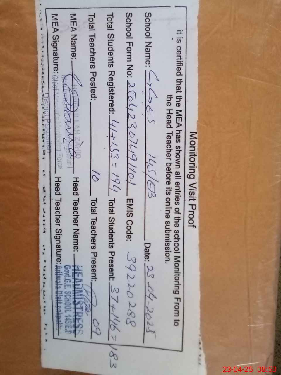 | Attendance Register | Head Teacher | MEA with School | Visit Proof |