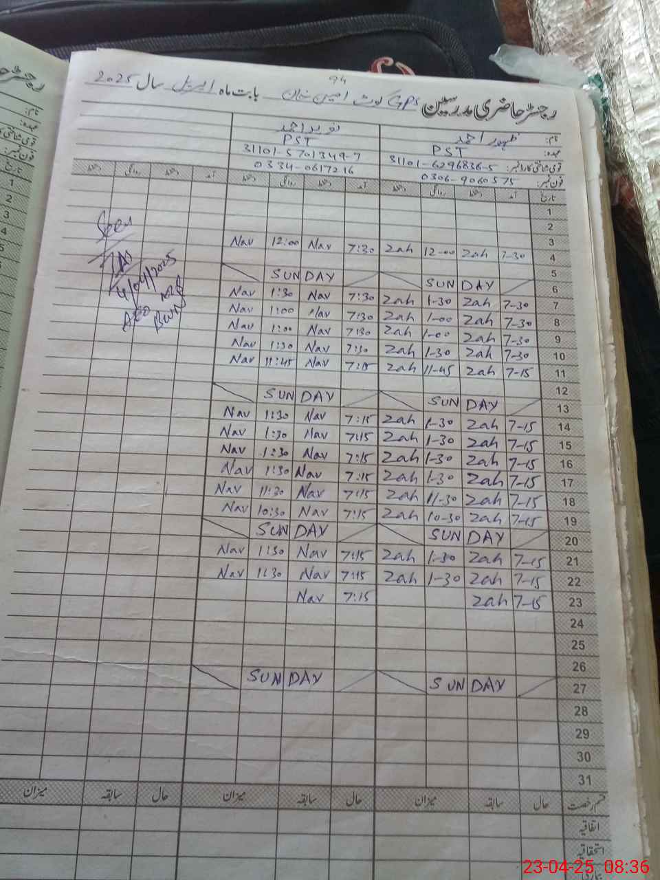 | CNIC | Full Name | Designation | R/C | Absence during last cal. month |
