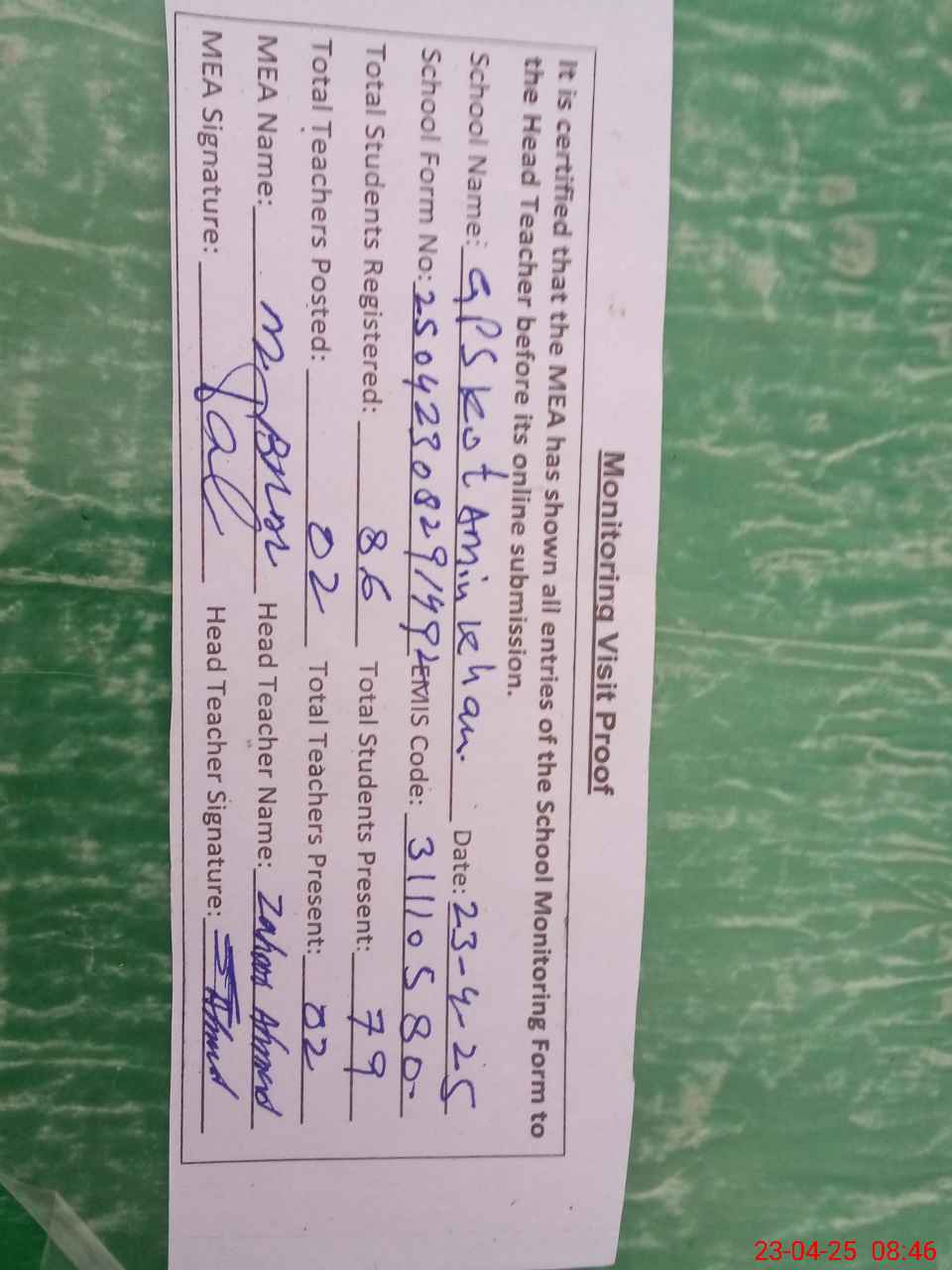 | Attendance Register | Head Teacher | MEA with School | Visit Proof |