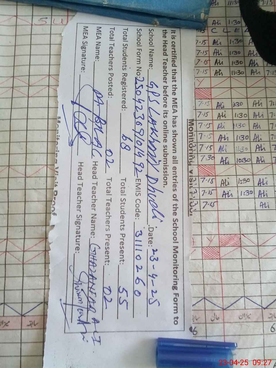 | Attendance Register | Head Teacher | MEA with School | Visit Proof |