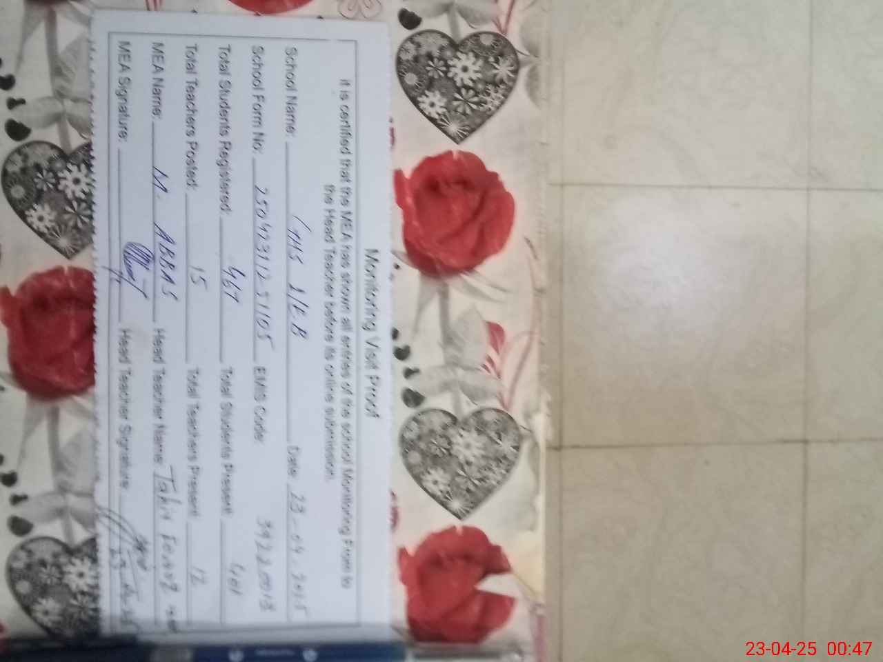 | Attendance Register | Head Teacher | MEA with School | Visit Proof |