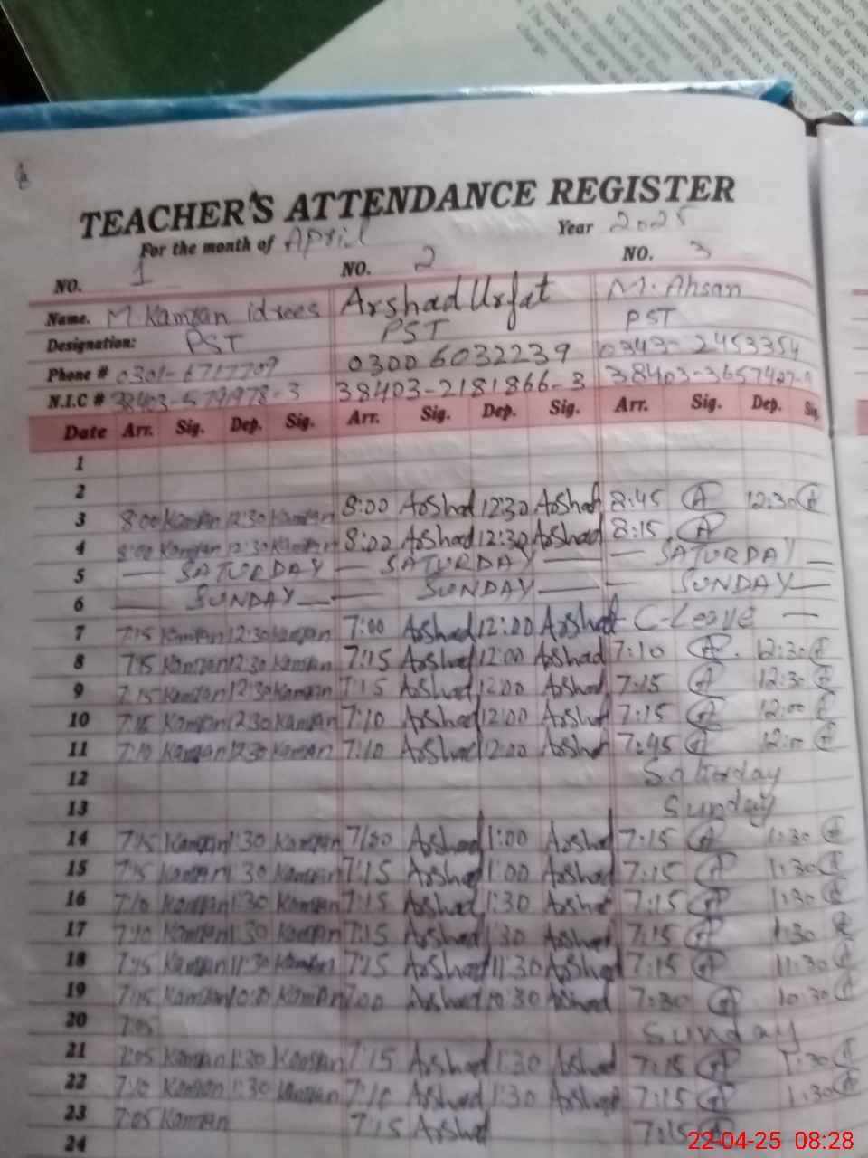 | CNIC | Full Name | Designation | R/C | Absence during last cal. month |