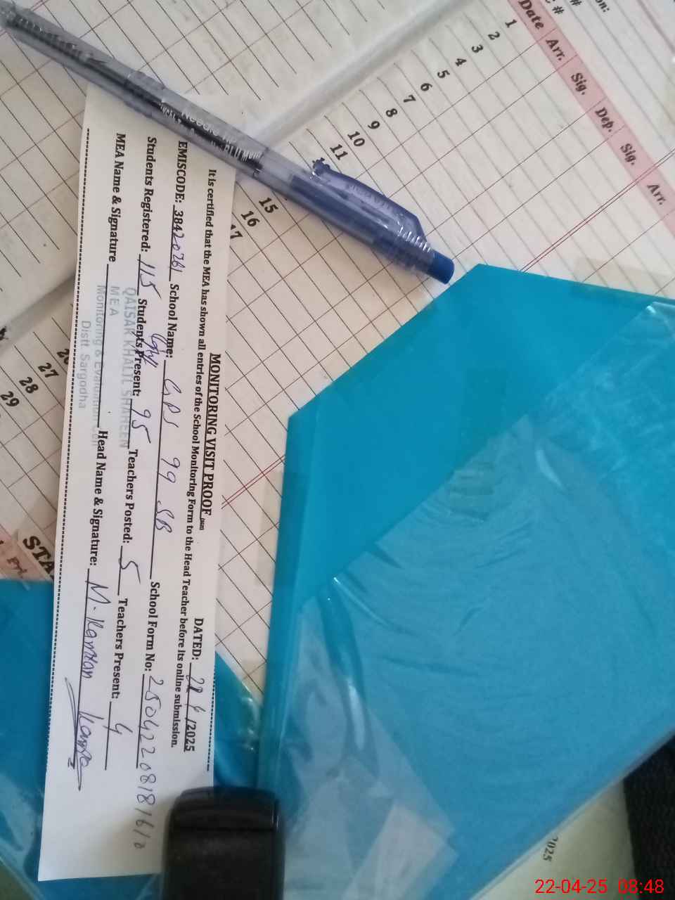 | Attendance Register | Head Teacher | MEA with School | Visit Proof |