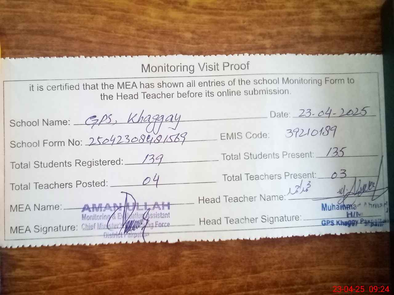 | Attendance Register | Head Teacher | MEA with School | Visit Proof |