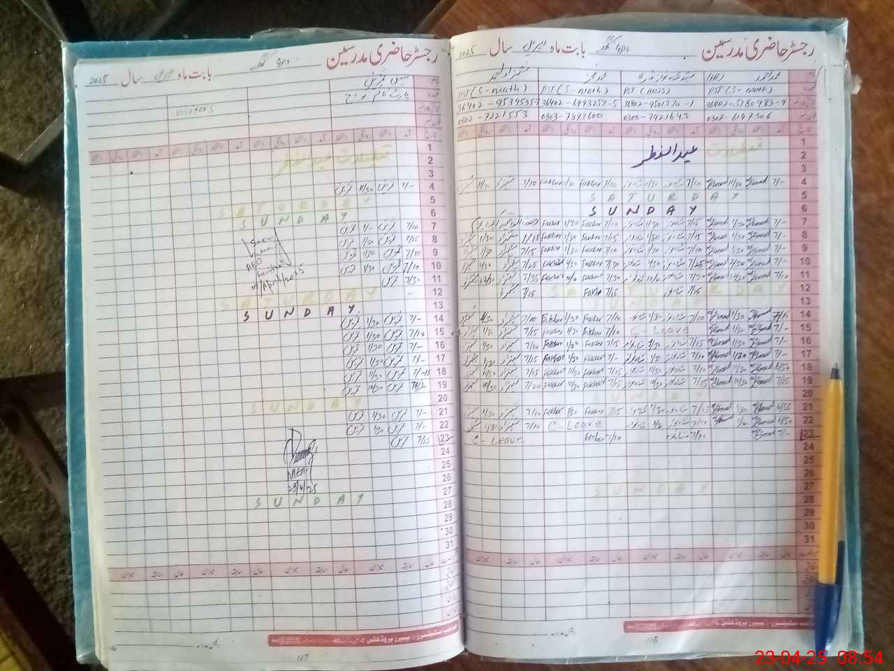 | CNIC | Full Name | Designation | R/C | Absence During Last Calender Month |
