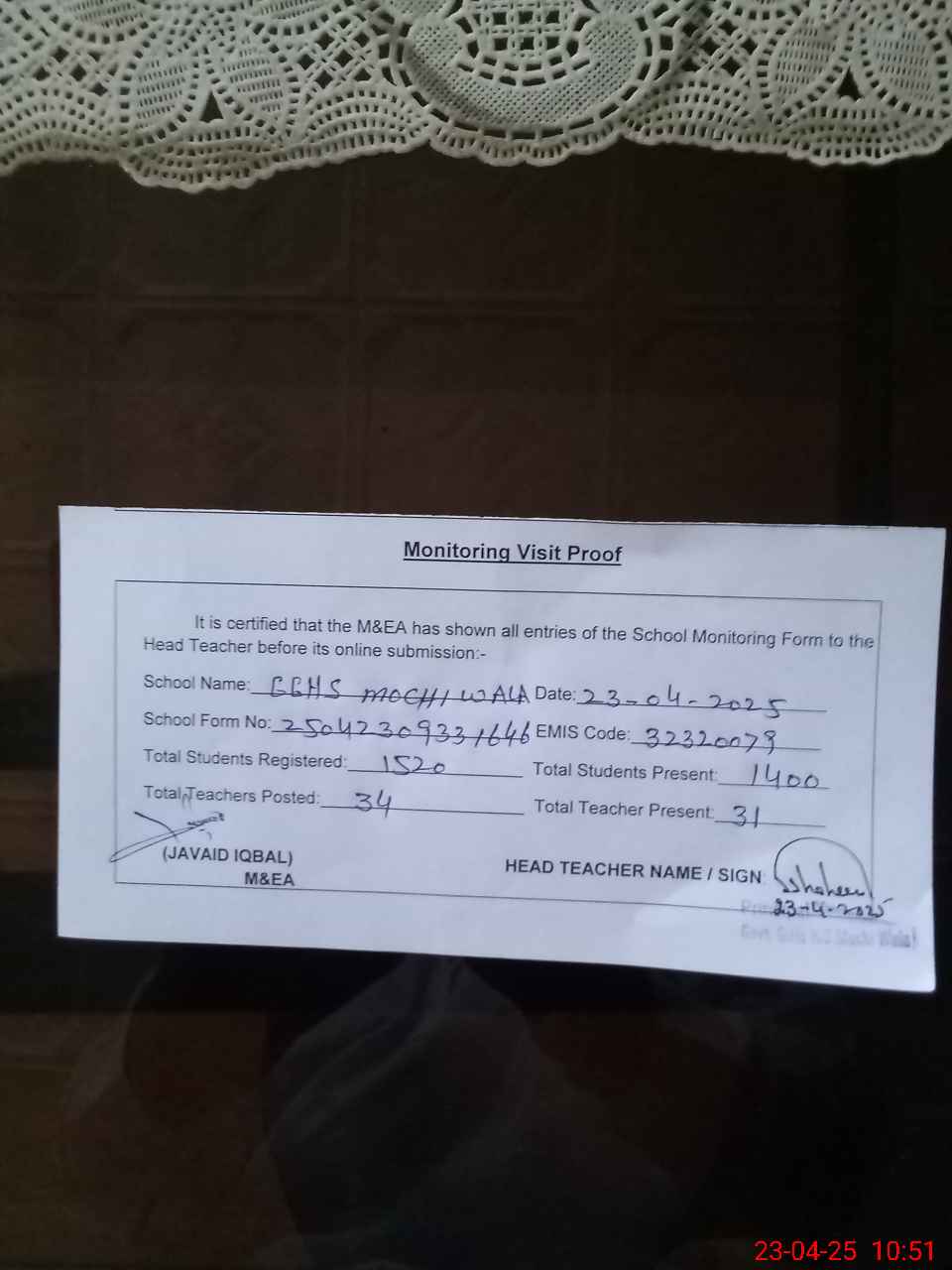 | Attendance Register | Head Teacher | MEA with School | Visit Proof |