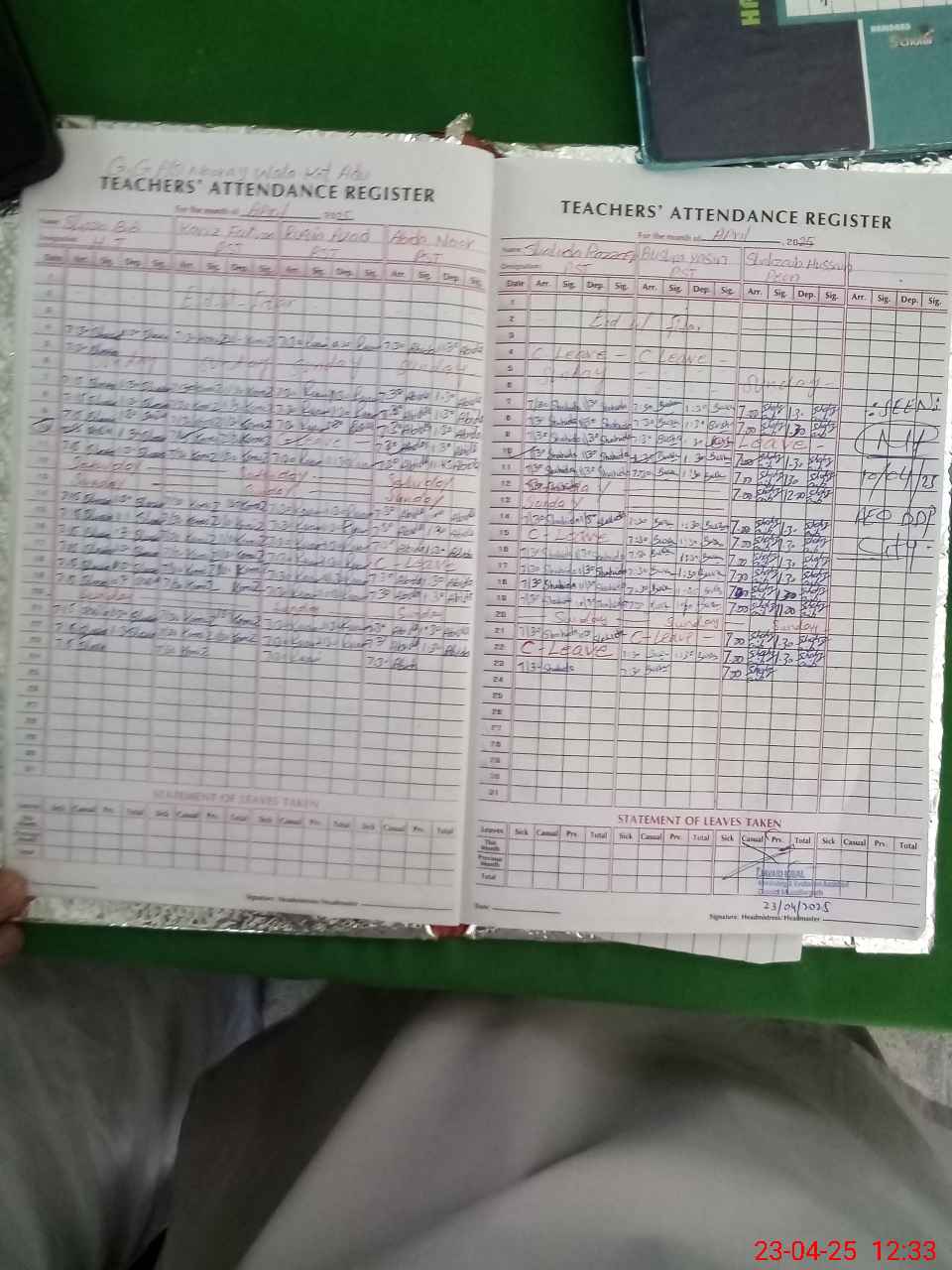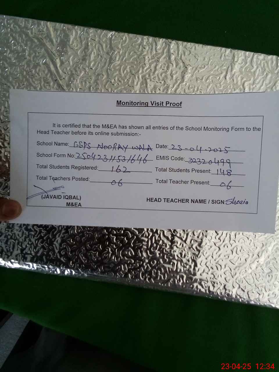 | Attendance Register | Head Teacher | MEA with School | Visit Proof |