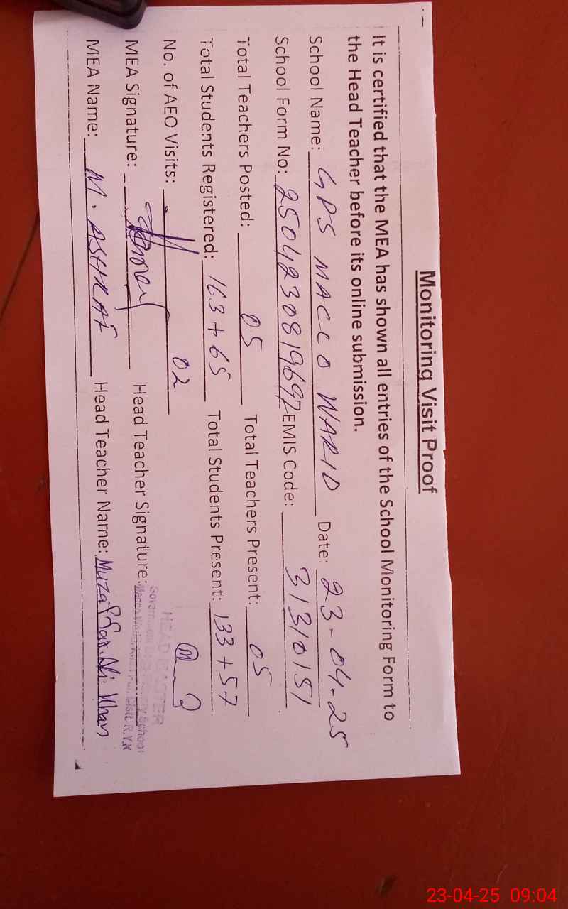 | EMIS Code: 31310151 | Name of School: GPS MACCO WARID (After Noon) | |||