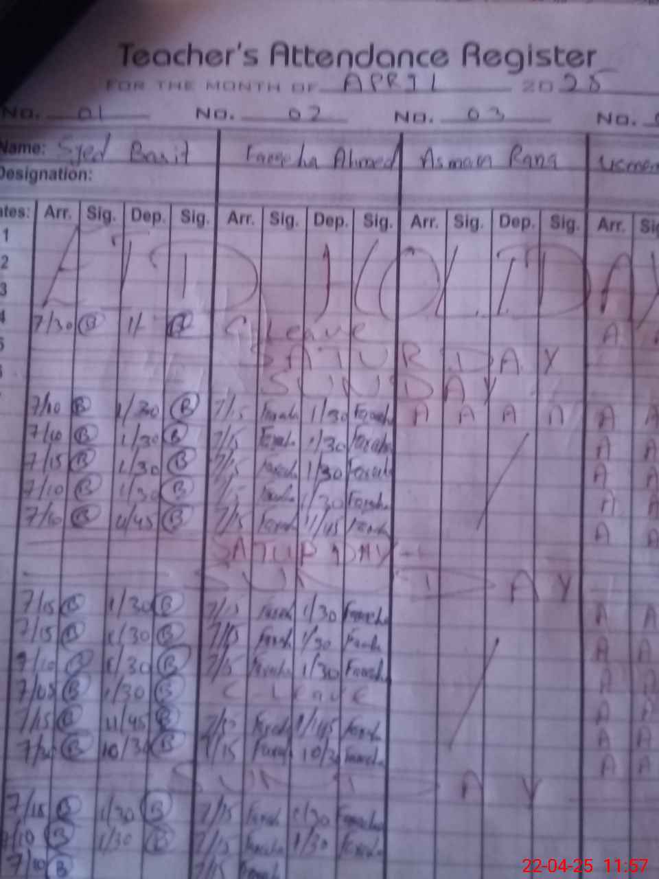 | CNIC | Full Name | Designation | R/C | Absence During Last Calender Month |