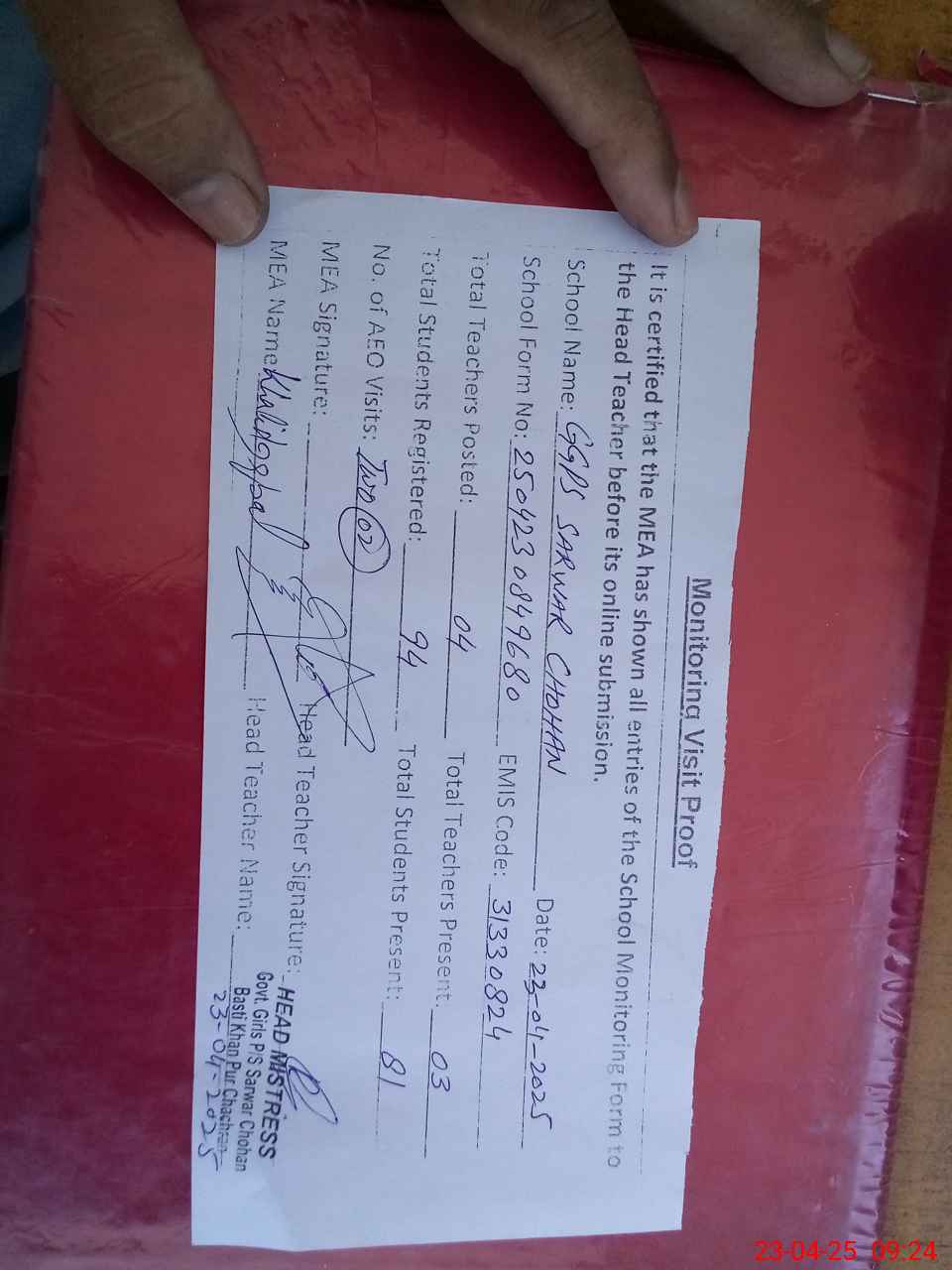 | EMIS Code: 31330824 | Name of School: GGPS SARWAR CHUHAN | |||